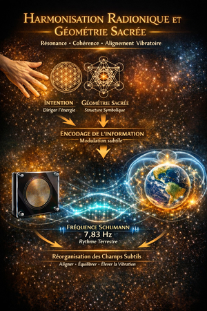 L’architecture interne du système intègre des structures issues de la géométrie sacrée dont la Fleur de Vie et des matrices proportionnelles harmonieuses utilisées comme supports symboliques d’attention et d’intention.